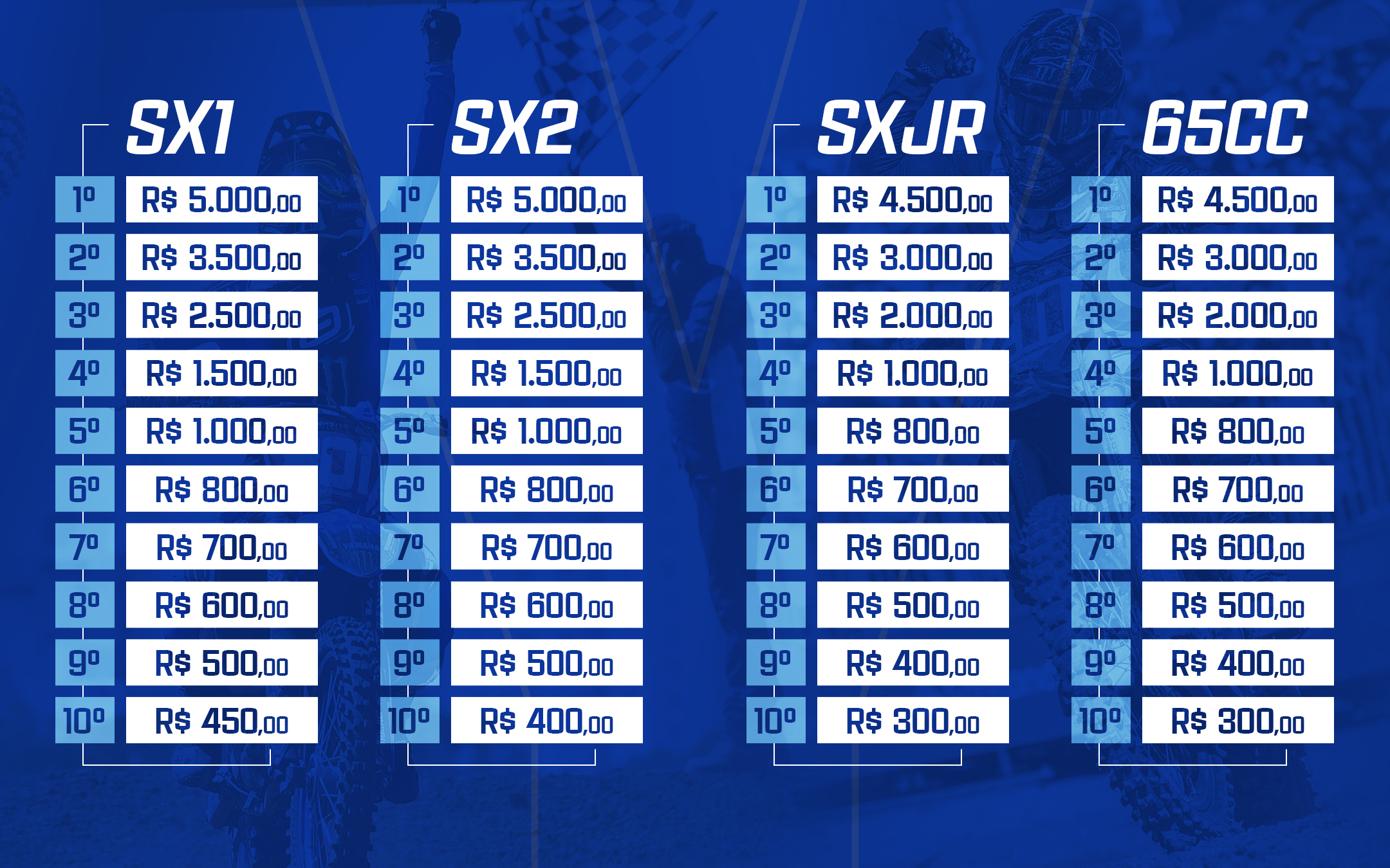 • O valor da premiação em dinheiro será definido conforme a classificação geral em cada etapa. Confira os valores abaixo: