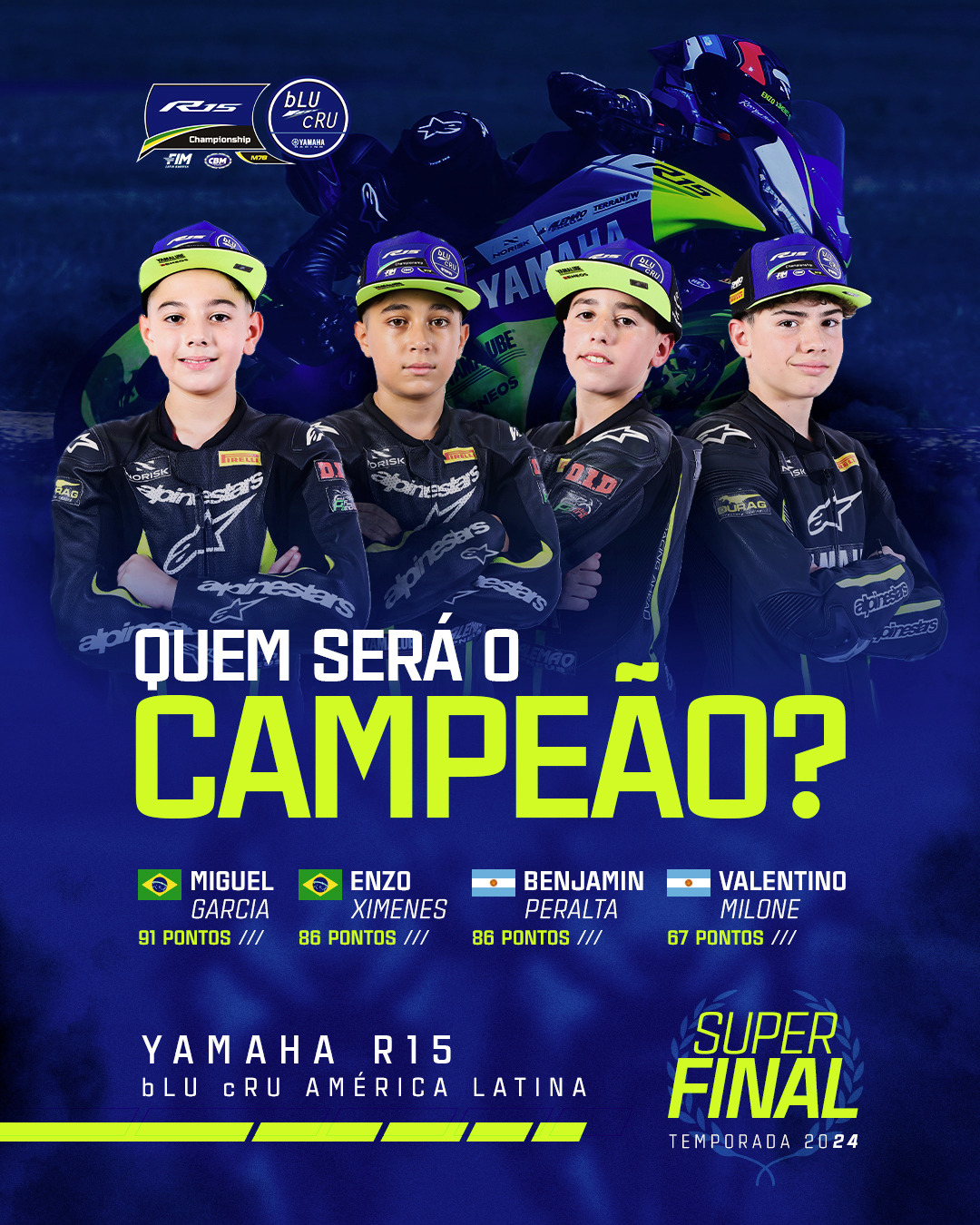 O momento mais aguardado pelos pilotos do Yamaha R15 bLU cRU América Latina está chegando: a Super Final no Autódromo de Interlagos. A última batalha pelo título de primeiro campeão da competição de base mais disputada do continente acontece neste sábado (7) em São Paulo e a disputa promete muita emoção, afinal, são quatro pilotos com chances de vencer o campeonato.