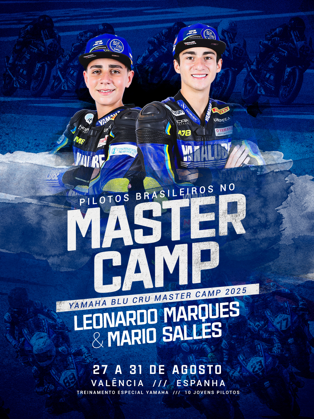 Os pilotos brasileiros Mário Salles Neto e Leonardo Marques vão participar do Yamaha BLU CRU Master Camp 2025, em Valência, na Espanha, de 27 a 31 de agosto. O treinamento faz parte do premiado programa BLU CRU da Yamaha, que constitui a base da pirâmide Yamaha Racing. O projeto é desenvolver futuras estrelas do motociclismo em modalidades on-road e off-road, tendo como objetivo final a promoção às principais categorias: MotoGP, Mundial de Superbike e Mundial de Motocross.