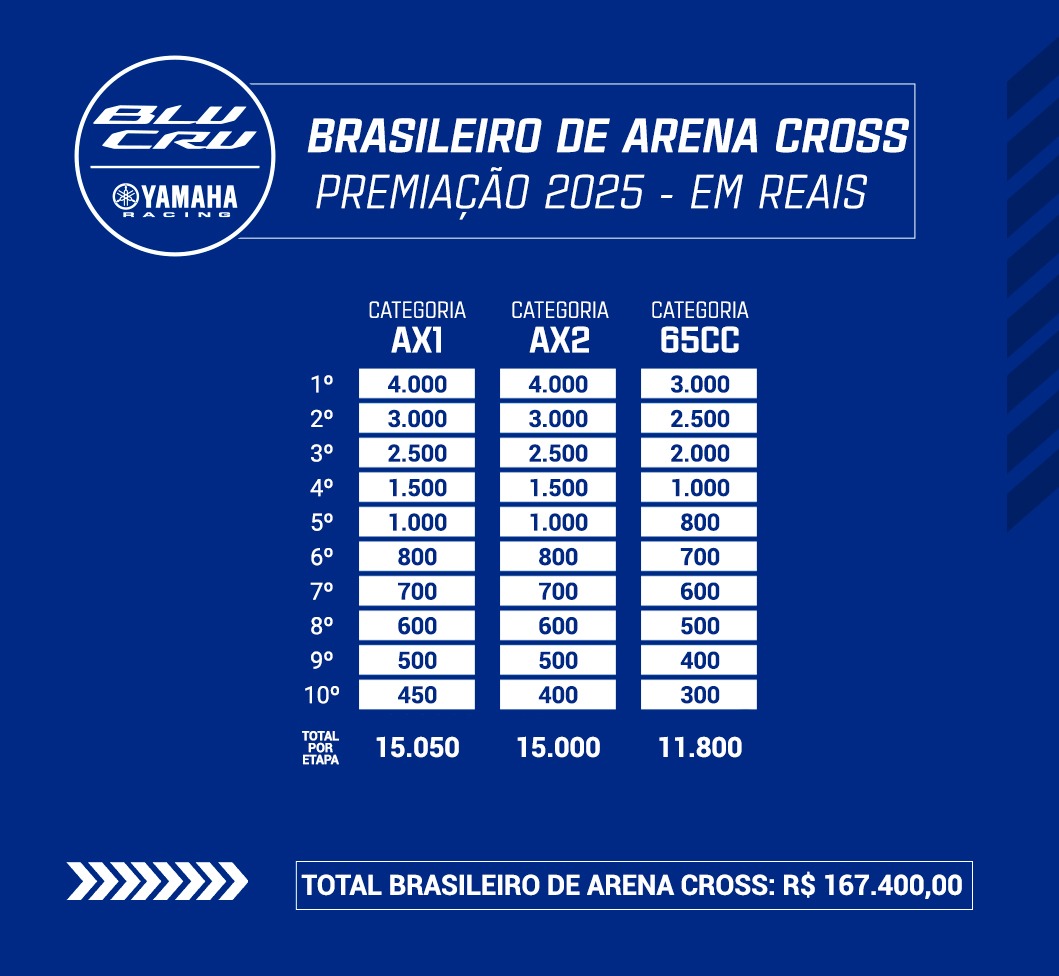 Uma das grandes atrações para 2025 é a inclusão do Arena Cross no Programa BLU CRU. No campeonato, os 10 melhores colocados das categorias AX1, AX2 e 65cc serão premiados, expandindo significativamente o alcance do Programa e fortalecendo o incentivo a novos talentos. Somando as premiações de todas as categorias, o prêmio pode somar o total de R$ 167.400,00 para pilotos independentes que competirem utilizando motocicletas Yamaha.