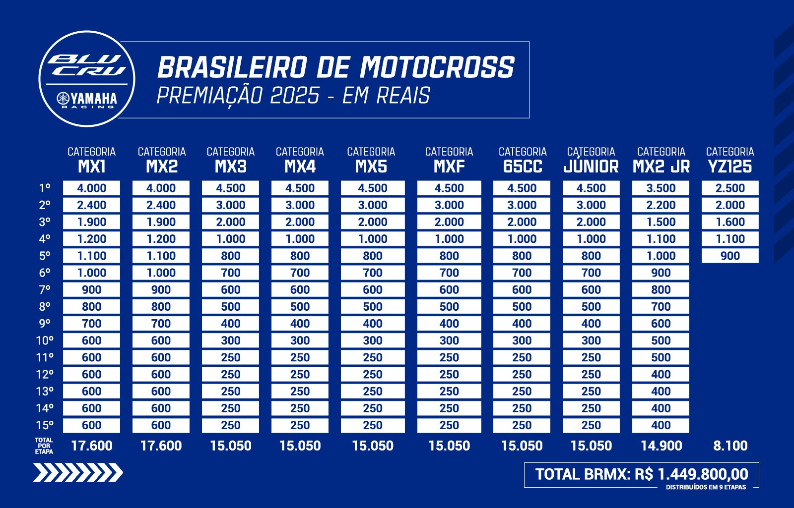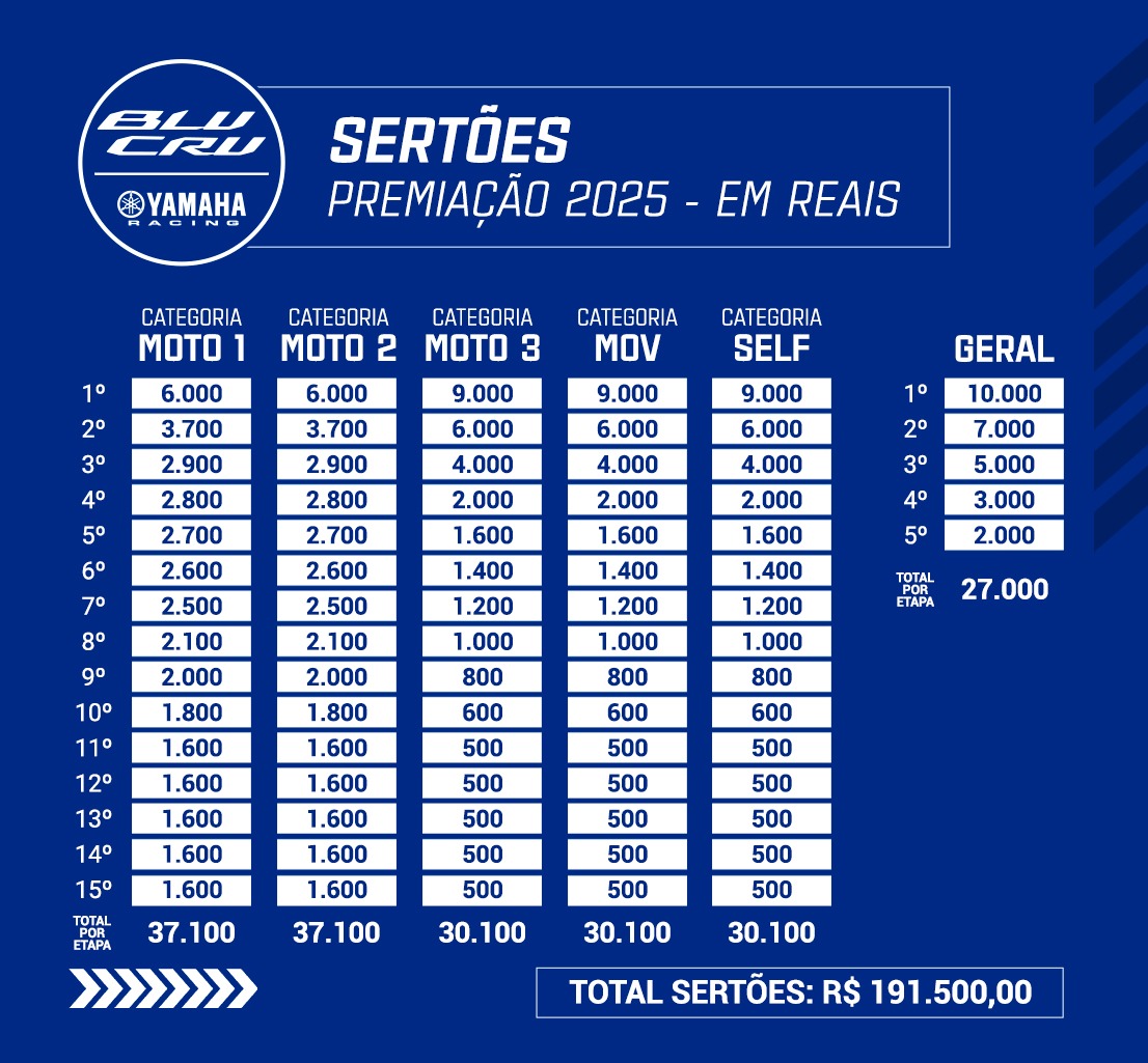 O líder da temporada garante uma vaga na Superfinale YZ125 BLU CRU no MXGP/Motocross das Nações 2025, e o campeão se junta ao Yamaha BLU CRU M78 Racing Team para competir na MX2JR em 2026. A categoria premiará os cinco primeiros colocados em dinheiro e a premiação por etapa ultrapassa os oito mil reais.