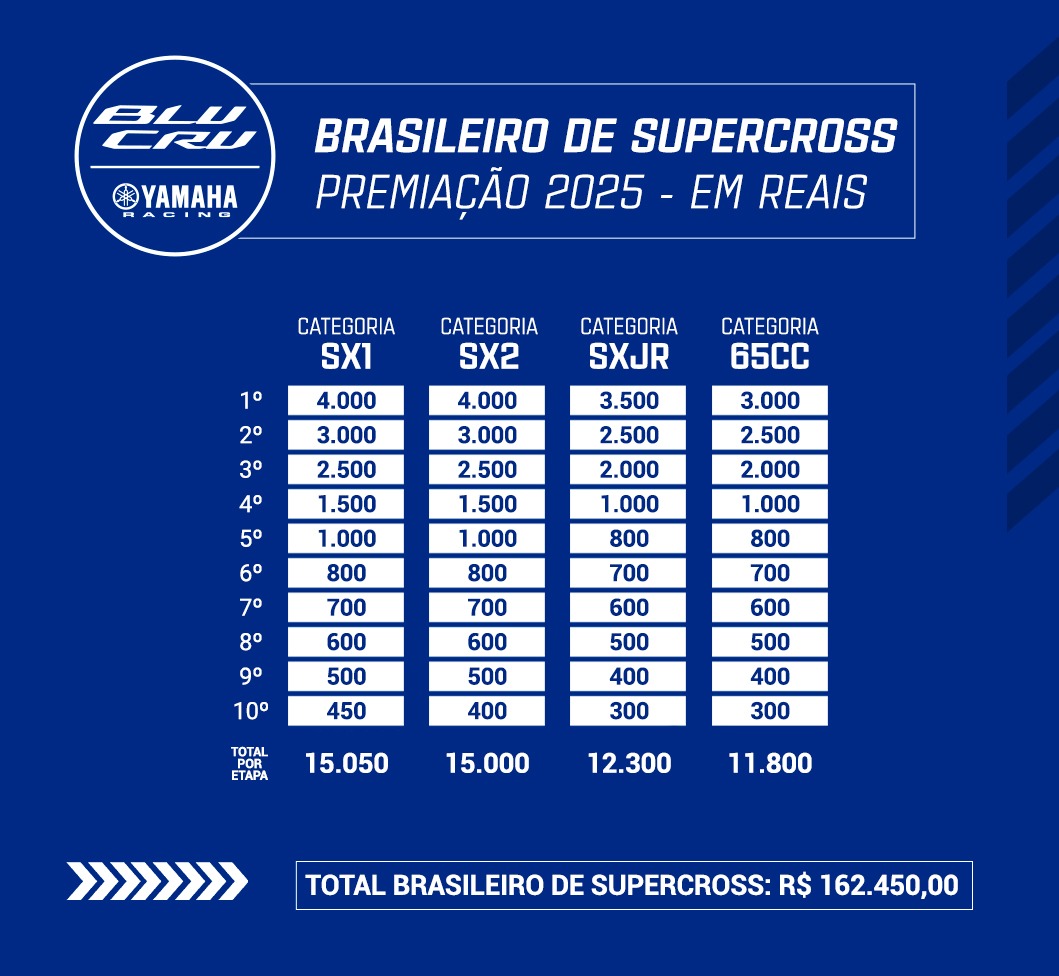 Desde 2024, os pilotos que competem no Campeonato Brasileiro de Supercross têm acesso aos benefícios exclusivos do Programa BLU CRU. Com foco em incentivar o talento e a dedicação dos atletas, o programa premia as categorias SX1, SX2, SXJR e 65cc. Um total de R$ 162.450,00 está disponível para premiar pilotos independentes que participarem do campeonato utilizando motocicletas Yamaha.
