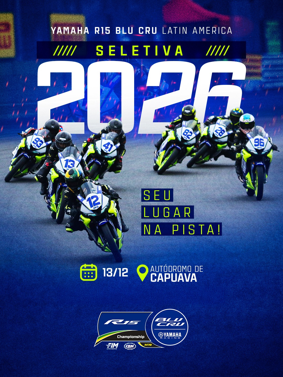 A seletiva para a próxima temporada acontece no dia 13 de dezembro no Autódromo Capuava, em Indaiatuba (SP) e os pilotos interessados em participar podem se inscrever preenchendo o formulário neste link: INSCRIÇÃO SELETIVA YAMAHA R15 BLU CRU AMÉRICA LATINA 2026.