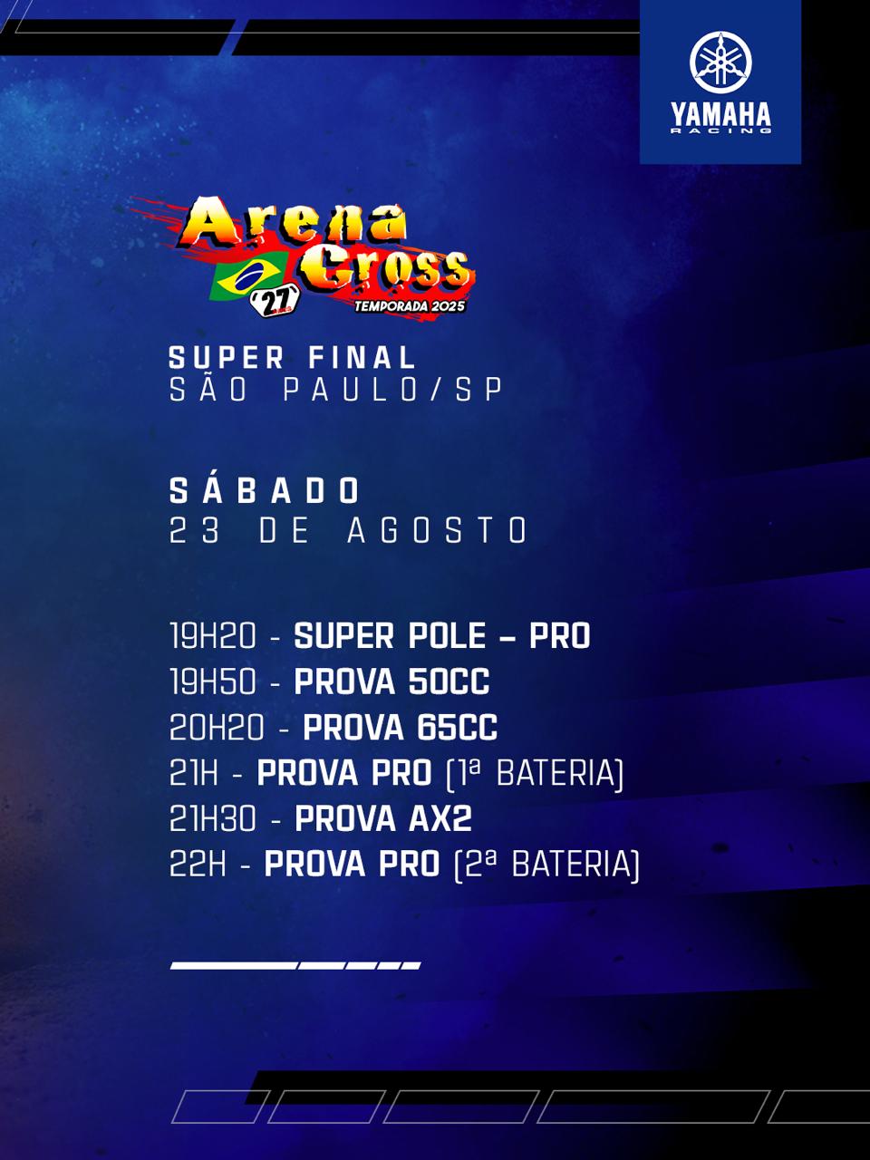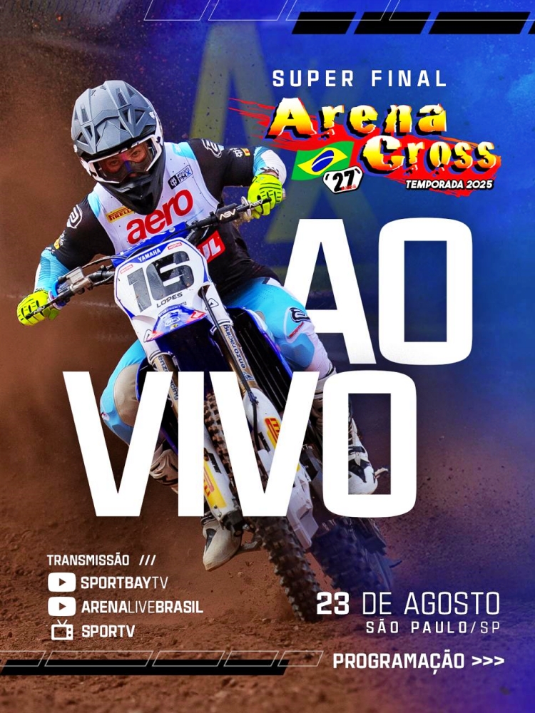 Transmissão AO VIVO: O canal SporTV exibirá as duas baterias da categoria PRO e da corrida da AX2. Na internet, as duas alternativas serão o Arena Live Brasil (www.youtube.com/@ArenaLiveBrasil), canal oficial do evento, e também o SportbayTV (www.youtube.com/@SportbayTV).
